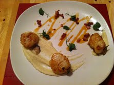 Seared King Scallops with a Celeriac and Truffle Puree, Crispy smoked bacon (confetti) and Apple Caramel:-