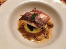 Seared fillet of Seabass, Saffron Mash, spinach, cockle and mussel bisque and