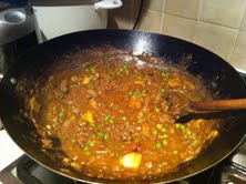 Fry off the Onion, Garlic, Ginger, chillies and dry spices for a few minutes. Add the meat and the seasoning until the meat has browned and cooked through. Add the Stock, Tomatoes, puree, and cook on the stove for about 10 minutes, checking that it wont go too dry or stick etc. Add the potatoes and cook for a further 5-10 mins and a few minutes before it is done, add the defrosted peas.