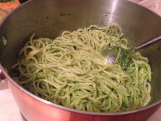 Once the fish is done, Toss your drained spaghetti with the pesto, flake the Sea bass onto the spaghetti and drizzle over your Tomato salsa.