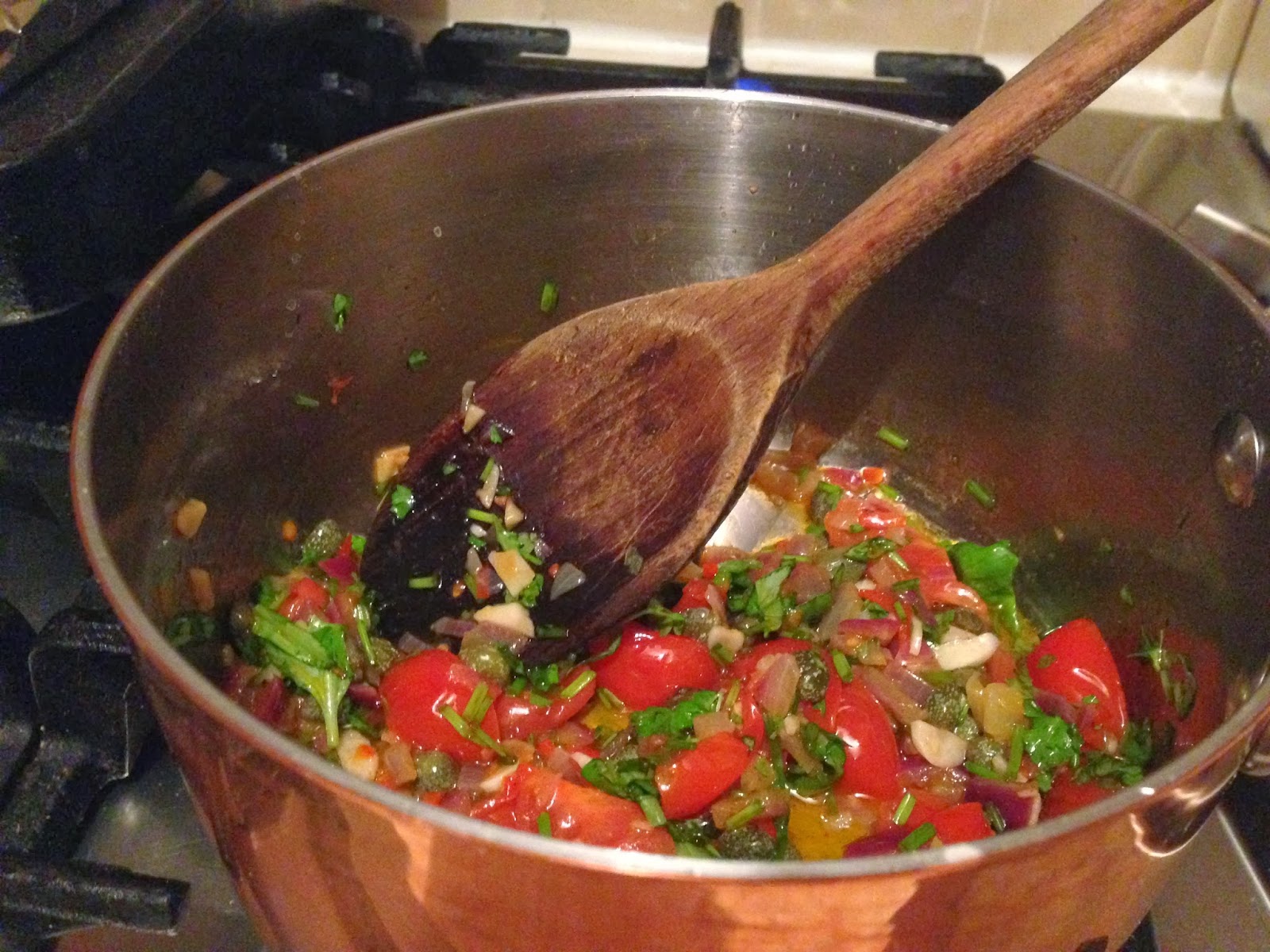 Place all ingredients into a hand blender or food processor and blitz! Adding more olive oil and seasoning if need be. Then chop all your ingredients for your Salsa (as shown above). Not forgetting of course to cook your spaghetti ! Place the salsa in a pan to gently heat. You do not want this to go to mush.