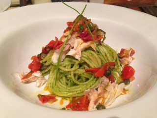 Roasted flaked Sea bass with Pesto Spaghetti and Tomato Salsa: