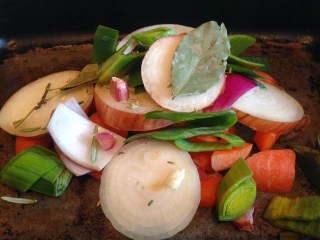 Place all of the vegetables and herbs as above into a deep roasting tray. You will notice there is a little bit of red onion on the picture as it just needed using up, just like the rest of the tray veg.