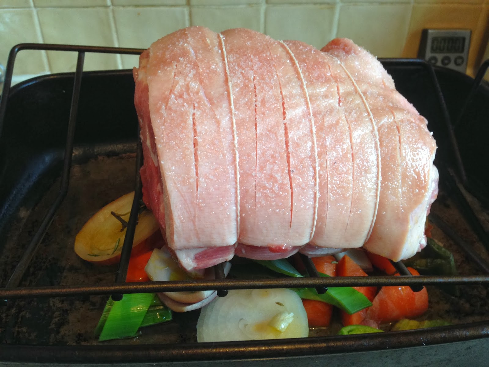 Score the pork skin with a Stanley knife and rub in sea salt keeping it dry. Before your Pork goes on, add a drizzle of rapeseed oil over the veg. Place the Pork joint on top as so…