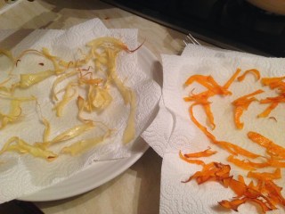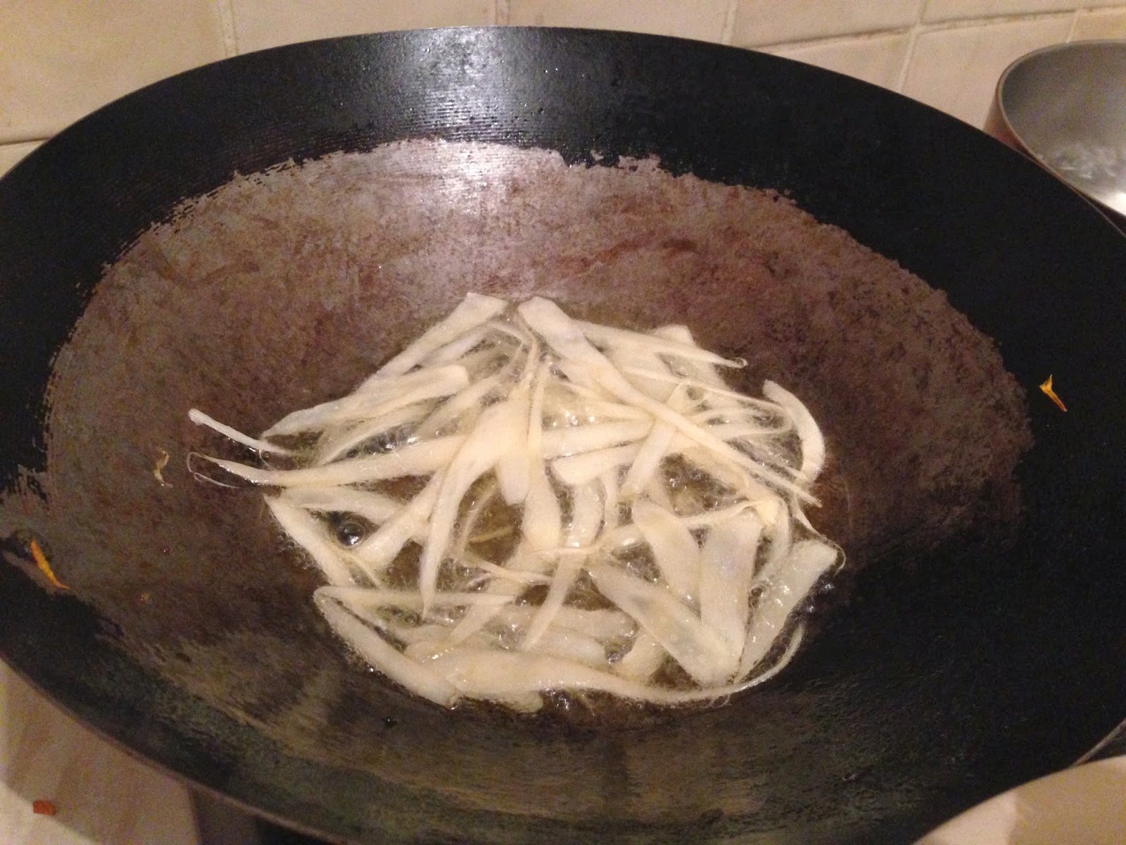 Whilst the Risotto is cooking away, Peel your Parsnip and Butternut Squash very thinly like so and fry off in oil. I have used a Wok but if you have a Deep Fat Fryer, great!