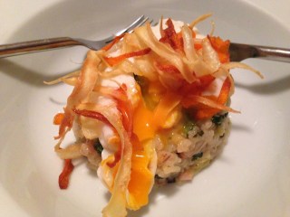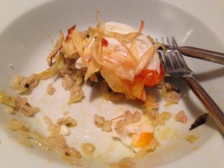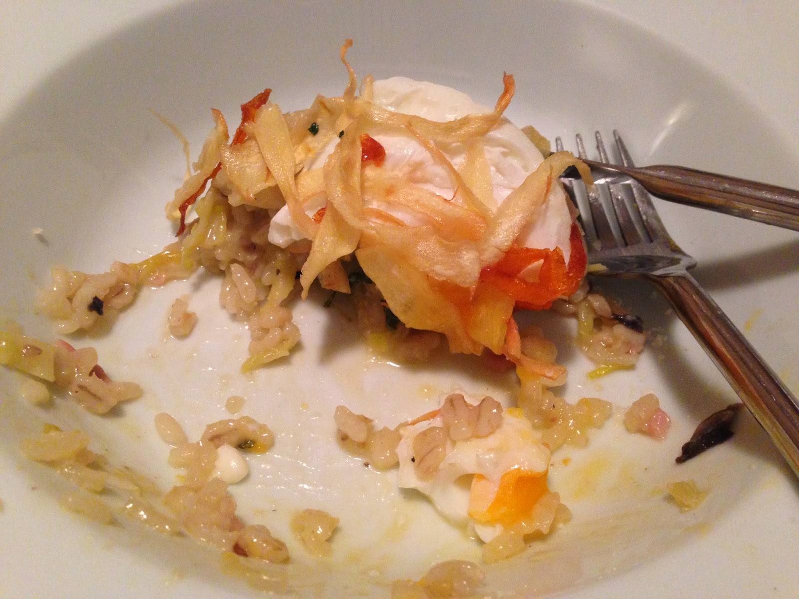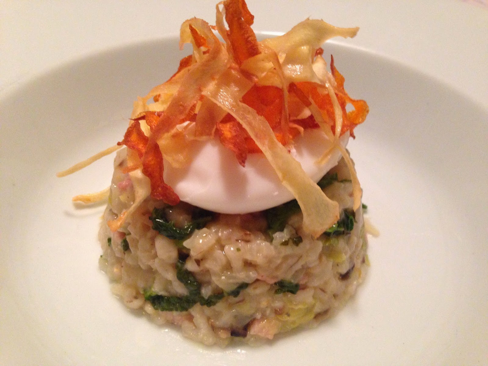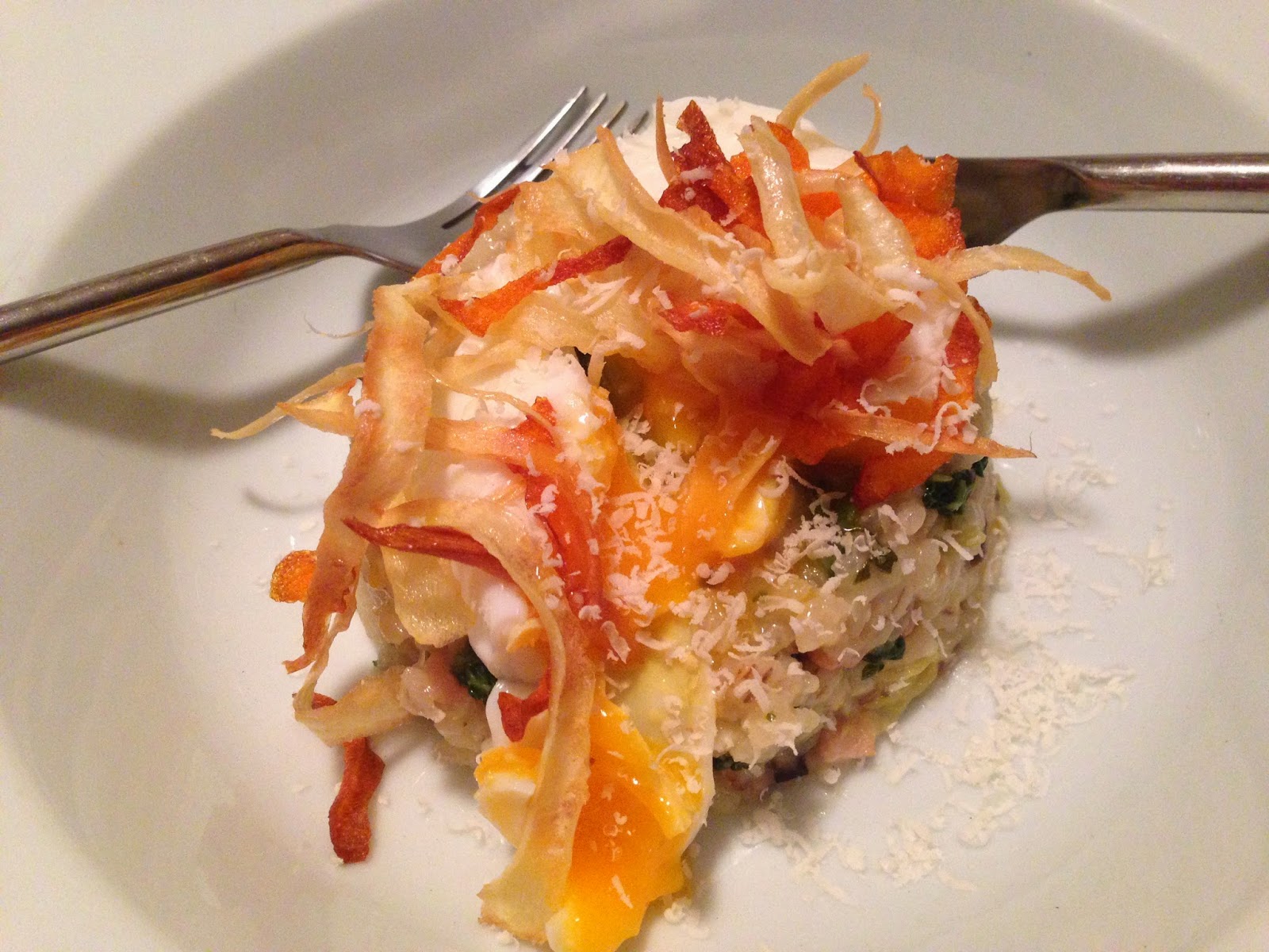 My 2 Grain Bubble and Squeak Risotto with Bacon, Poached Egg and vegetable crisps.
