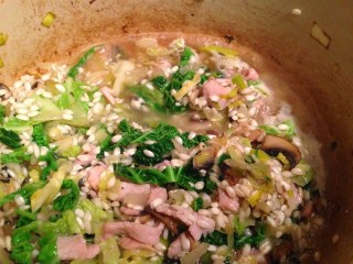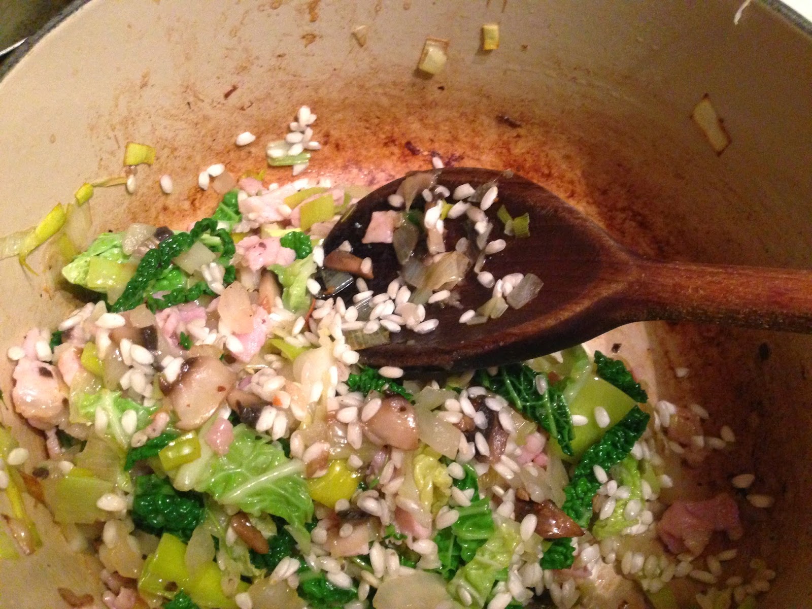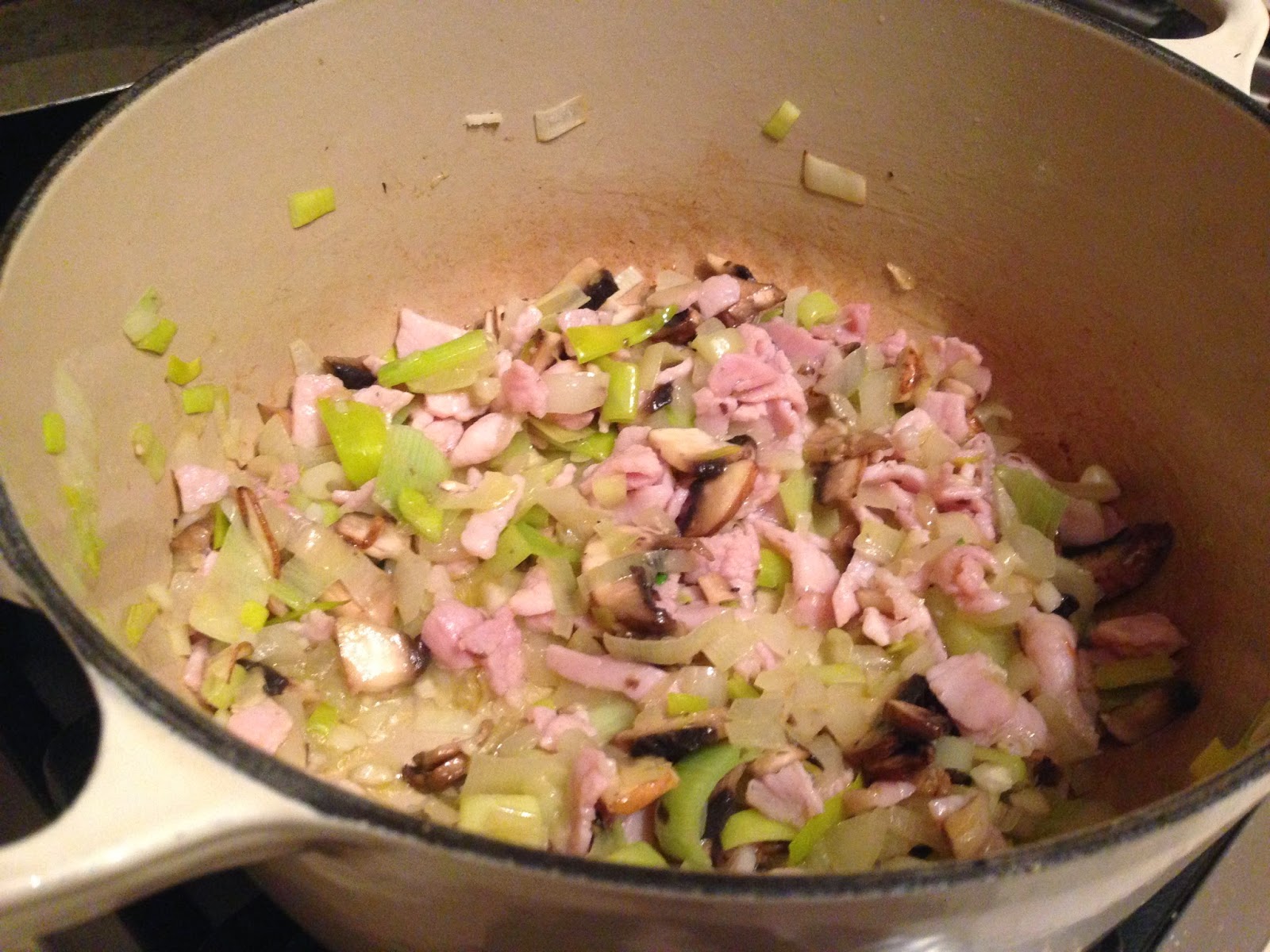 Add the Bacon, Mushrooms, 1/4 of the Cabbage first, Garlic and Thyme.