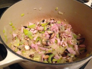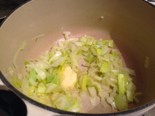 Fry off the Onion and Leek in some olive oil, then when starting to sweat down a little, add the butter.