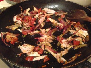 Add the chorizo and Green chilli. Then the cooked chicken and Herbs.