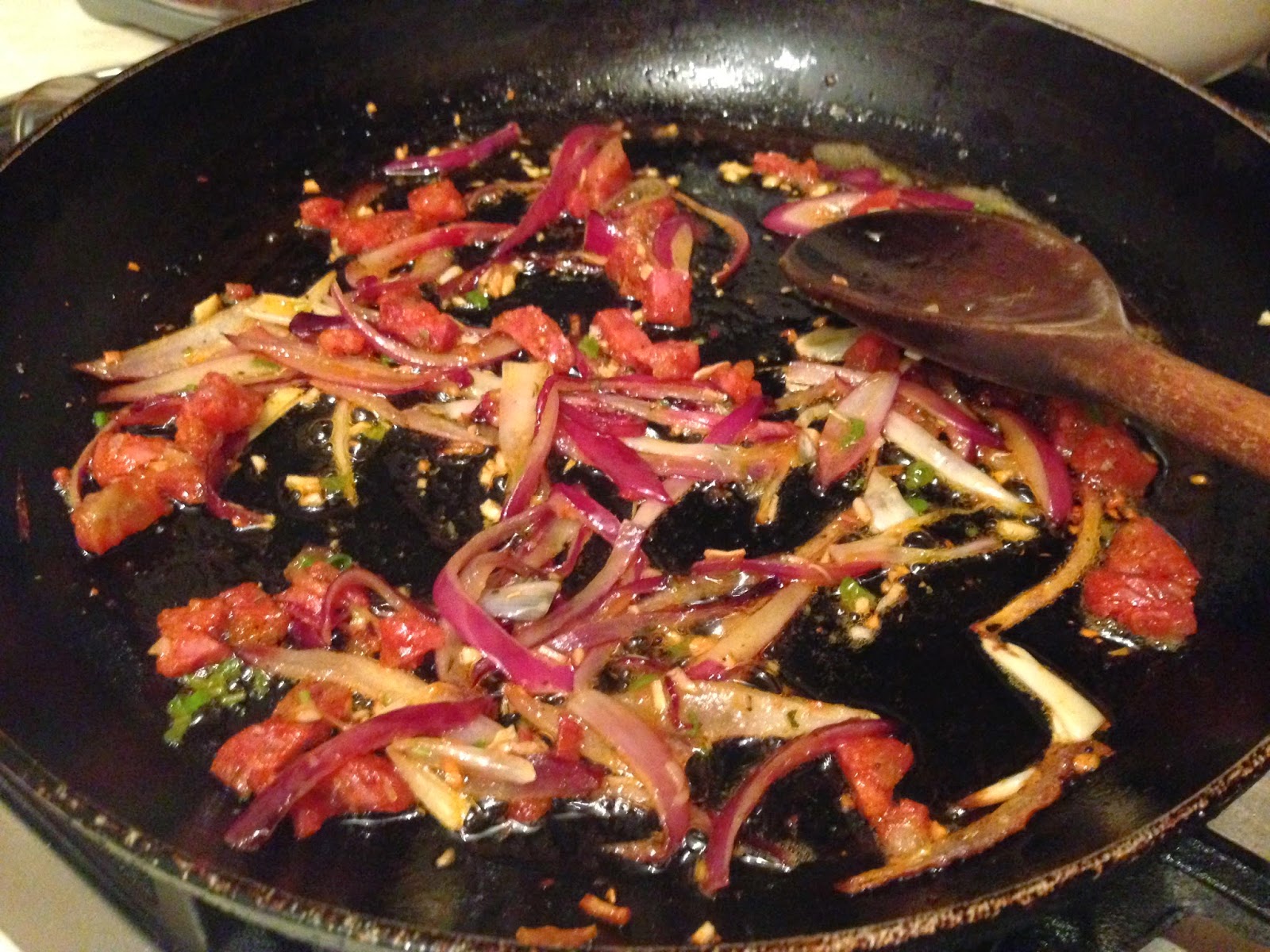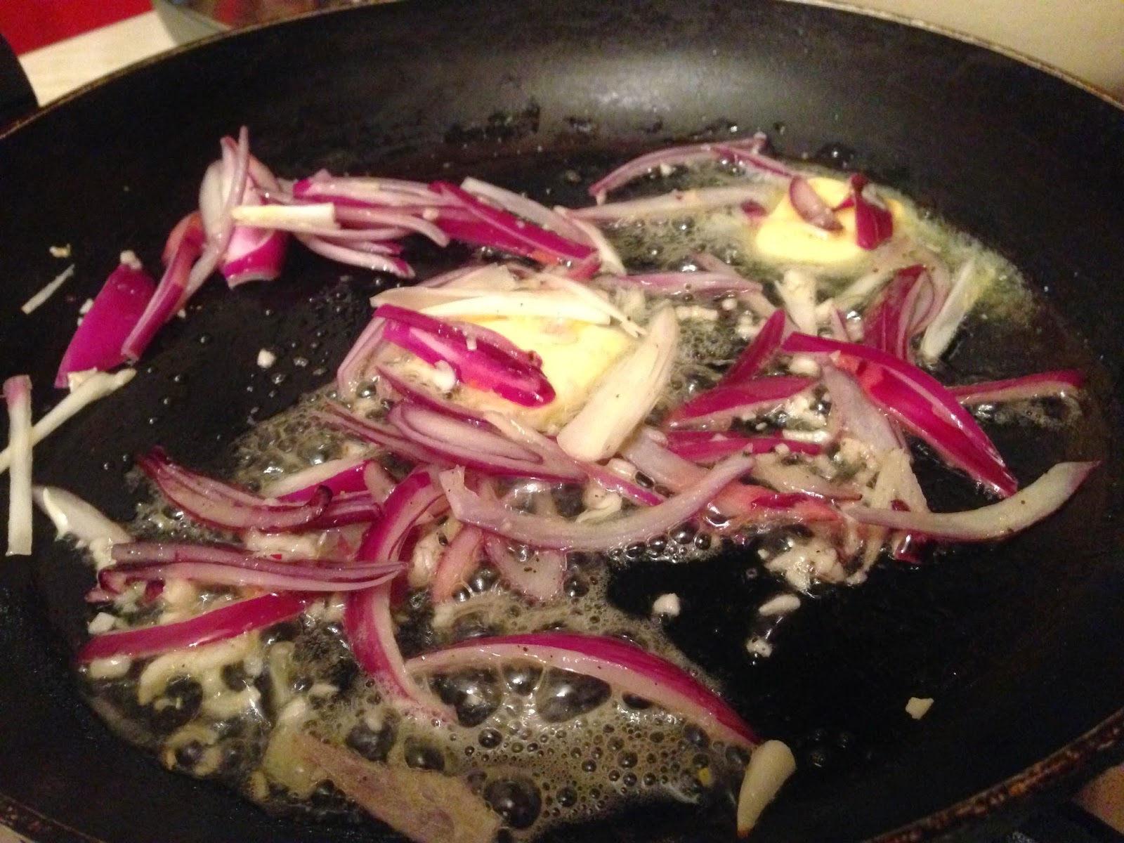 Fry off the Red onion and Garlic in oil and then add the butter.