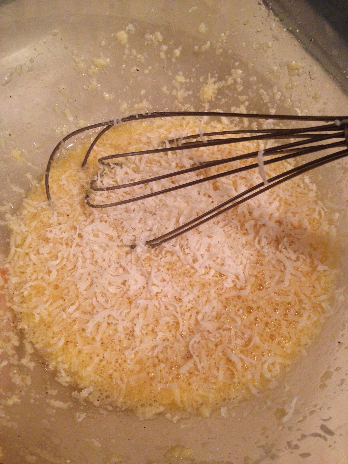 Whisk Eggs in a bowl and add in the grated parmesan cheese.