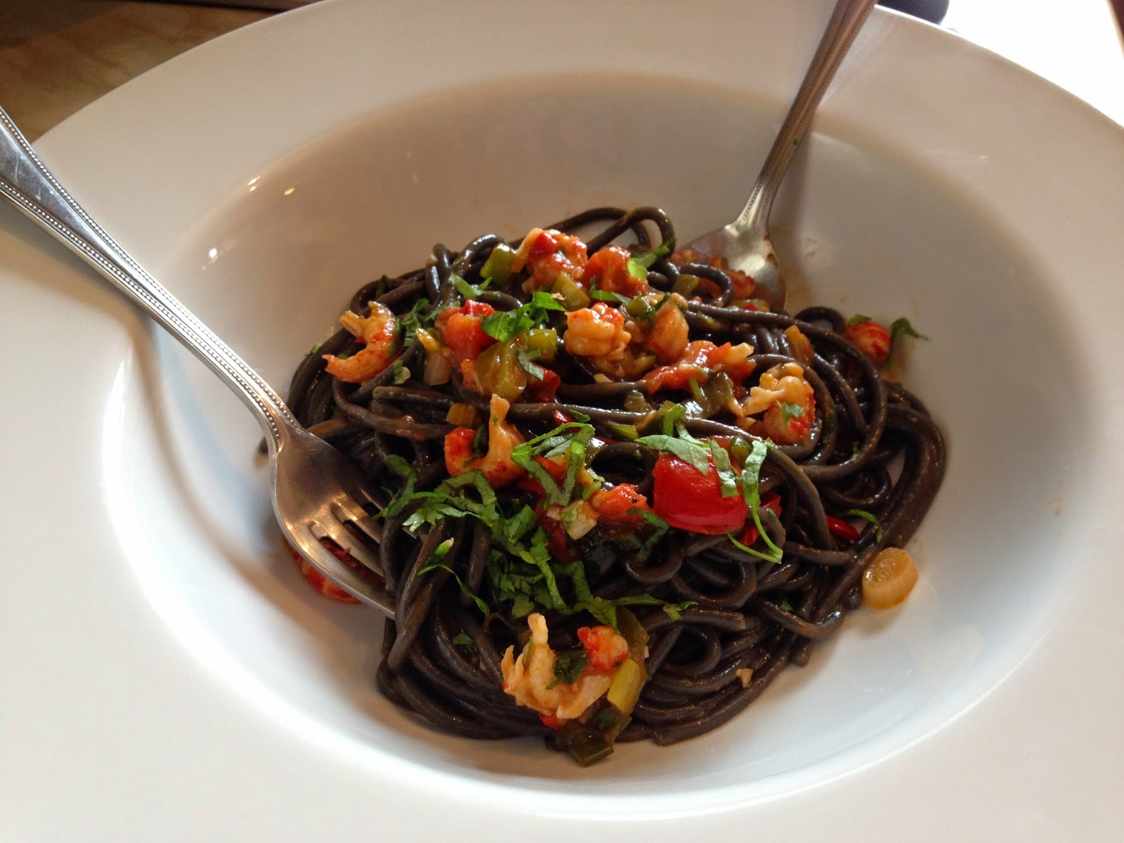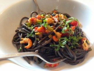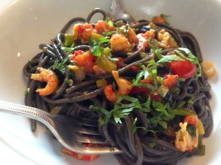 Squid Ink Linguini with Crayfish Tails,Tomato,Chilli and Garlic: