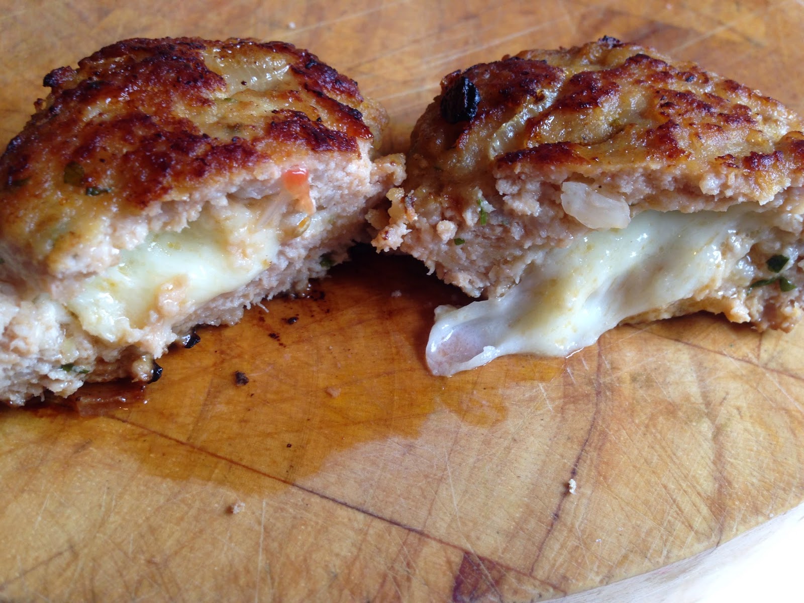 – Roll a small handful of the mixture into a ball, Press an inch sized ball of the Mozzarella into the middle, roll back into a ball and flatten into a burger.