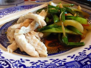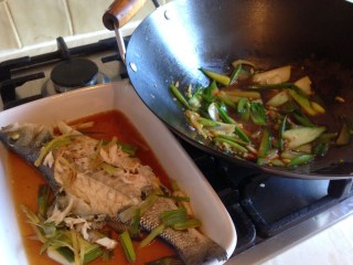 – After 10 minutes place the rest of your Spring Onions and ginger on top and half of your dressing over the fish. Continue to stem for a further 5 minutes.