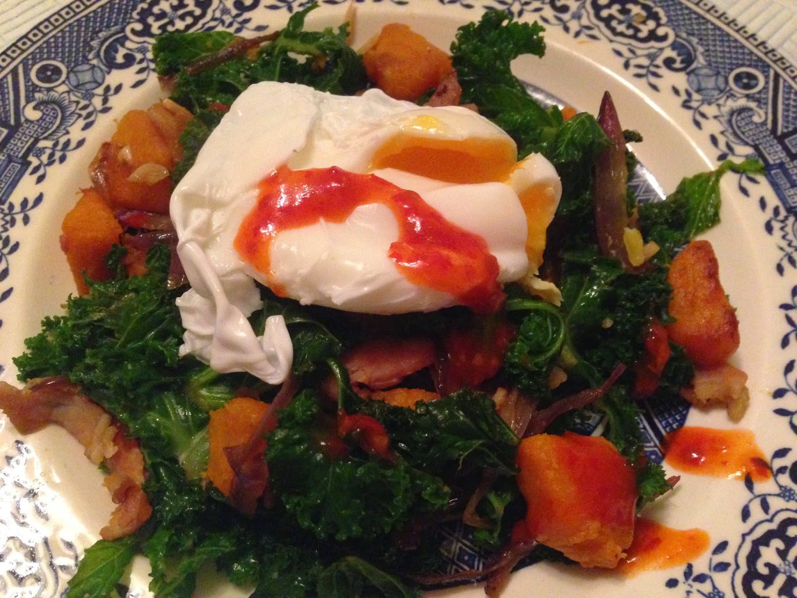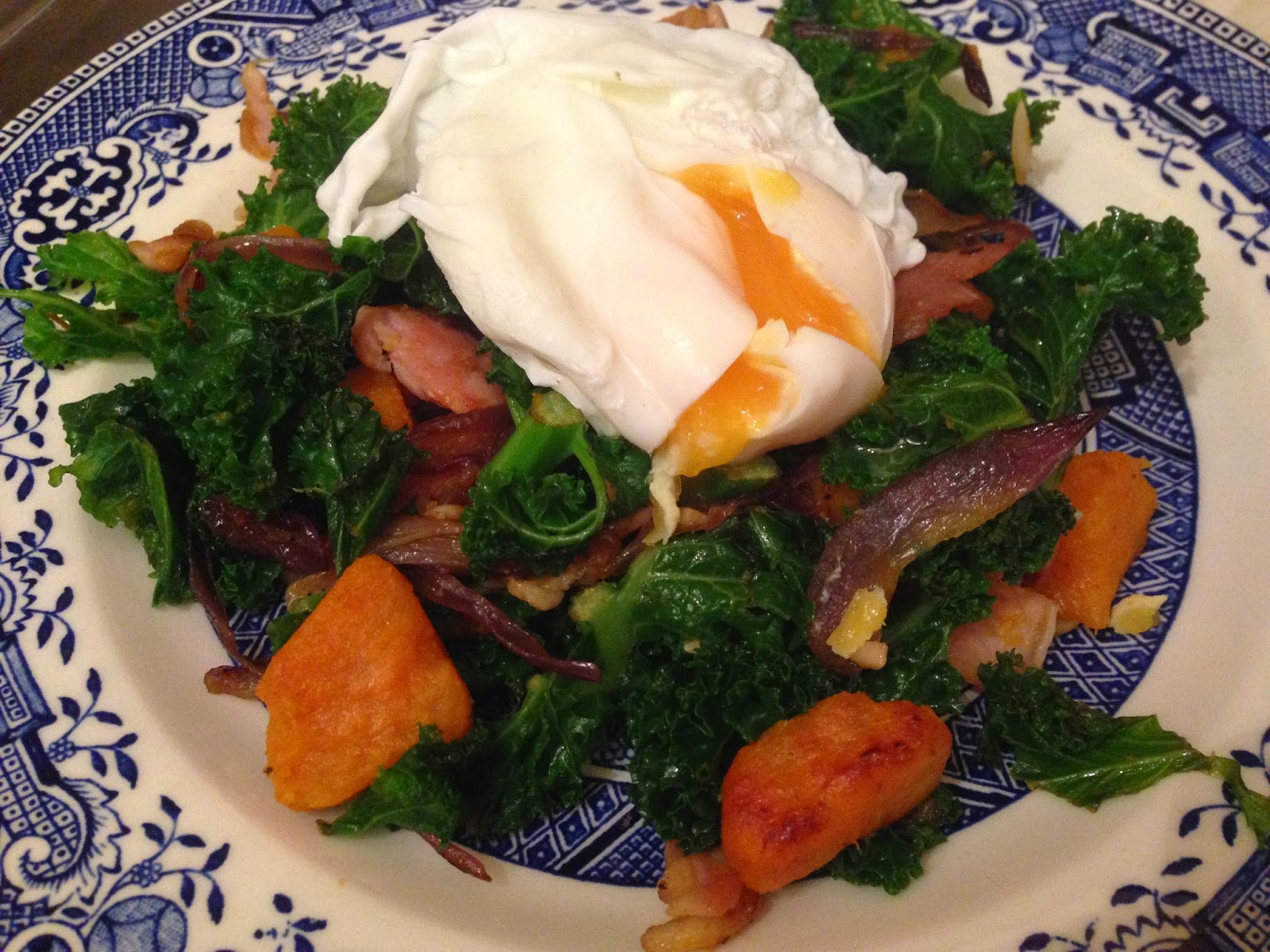 Sweet Potato, Kale and Bacon Hash topped with Poached Egg: