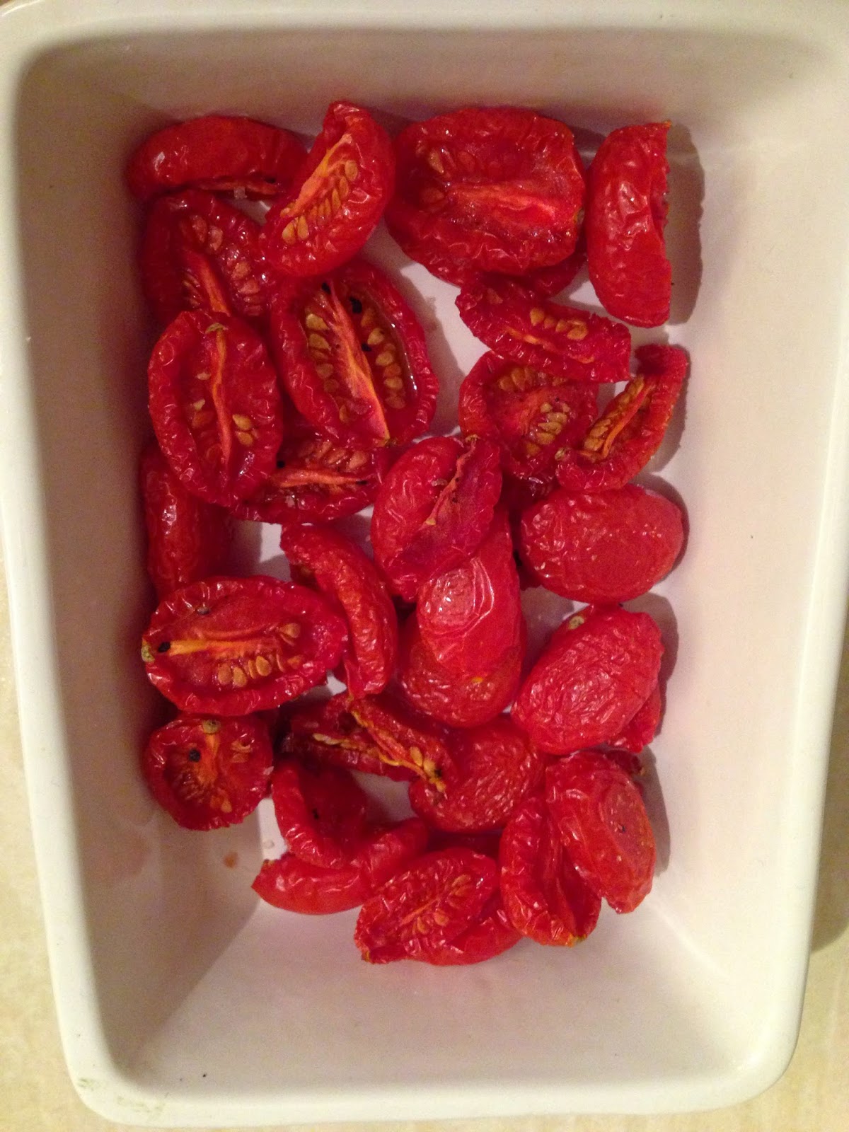 This is a great way of using up tomatoes when they are starting to “turn”. I used Baby Plum tomatoes in this recipe but you can do it with any, just have to have them longer in the oven (Low and slow) and the bigger they are, slice them thinner. Once you have done this you will never turn back.