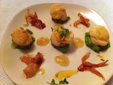 Seared King Scallops with a Celeriac and Truffle Puree, Crispy smoked bacon (confetti) and Apple Caramel:-